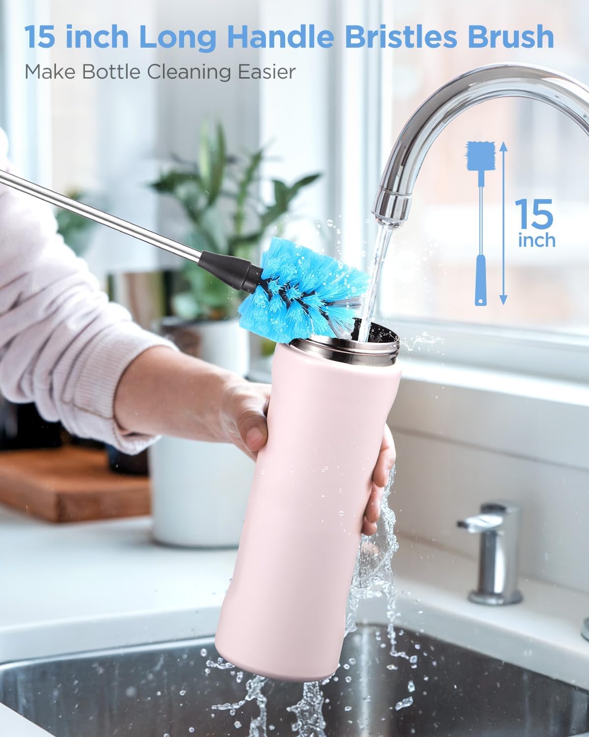 - 【15" Long Stainless Steel Scrubber】:This 15-inch long-handled bottle brush conquers tall water bottles [such us Stanley Cup/hydroflask/Owala Water Bottles], carafes, and deep Ice Tea jars. Featuring soft black bristles that safely clean delicate glassware without scratches, paired with sturdy grey tip bristles to powerfully scrub bottle bottoms and tight corners.