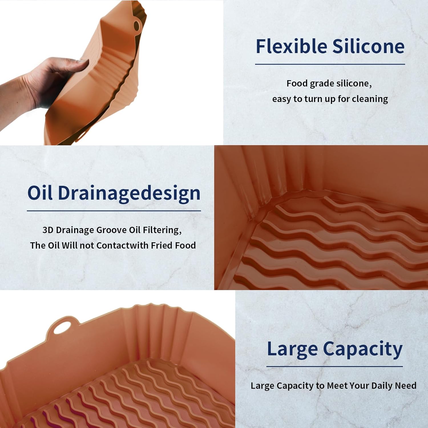 - [2-PCS Air Fryer Silicone Liners] Our square silicone air fryer liners is thicker, It's about 67mil thick, it's not fragile. Upper size 9 inches, bottom size 8 inches, 2.36 inches/ 6 cm in height, Fits 5 to 8 QT Air Fryer.