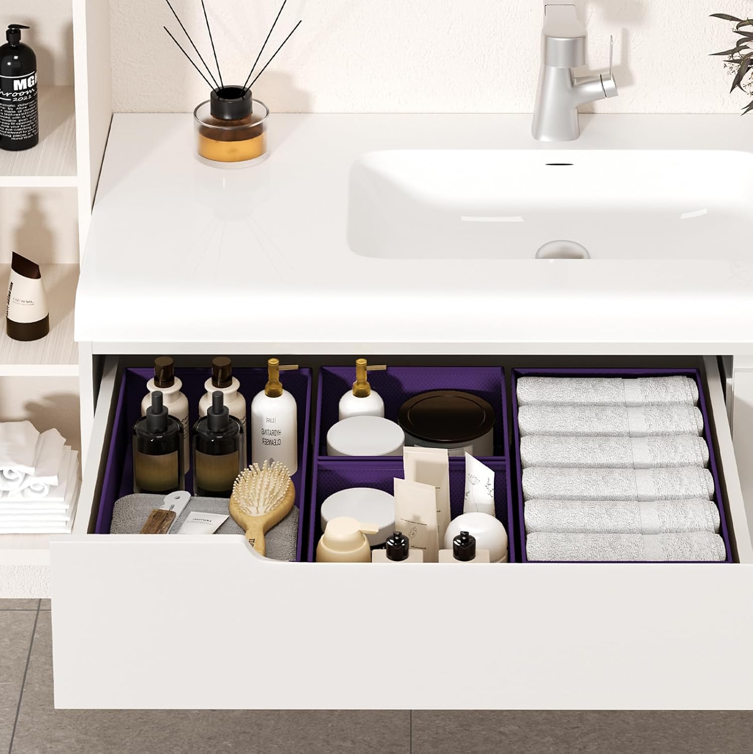 - What's Include: These Non-Woven fabric drawer organizer Includes 4 large square Drawer organizer bins,4 medium rectangular organizer bins and 4 small square organizer bins that can hold a variety of personal items. These Fabric foldable dresser storage fits all.