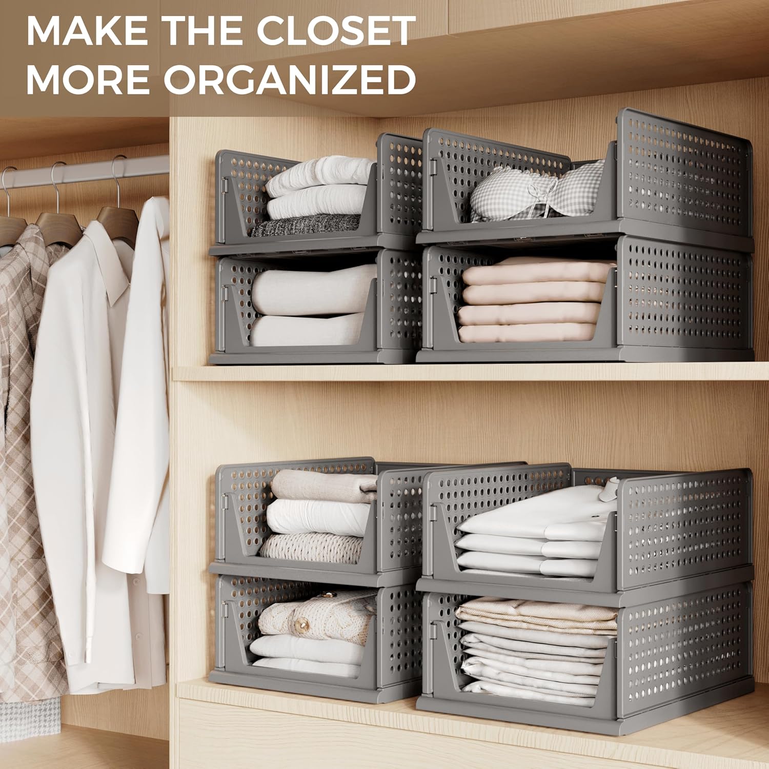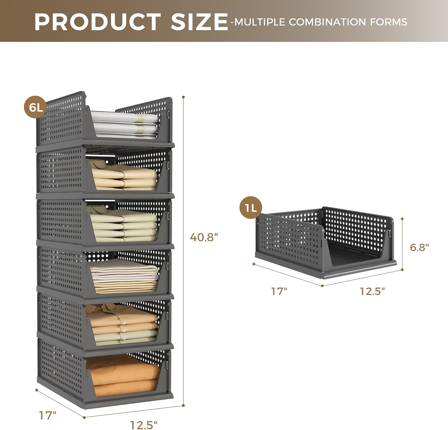 - 【Assembly Easily & Stackable】: Easy to set up, follow the steps in pictures. Adjust to your own liking by stacking the perfect number to fit your own space. Set of 6 wardrobe clothes organizer can be stackable which make home space organized, max the use of vertical space. You can stack multi-layer wardrobe storage organizer according to your needs freely.Dimensions of each when set up: 17" x 12.5" x 6.8" (L x W x H).Note: The depth of your cabinet should be no less than 17 inches