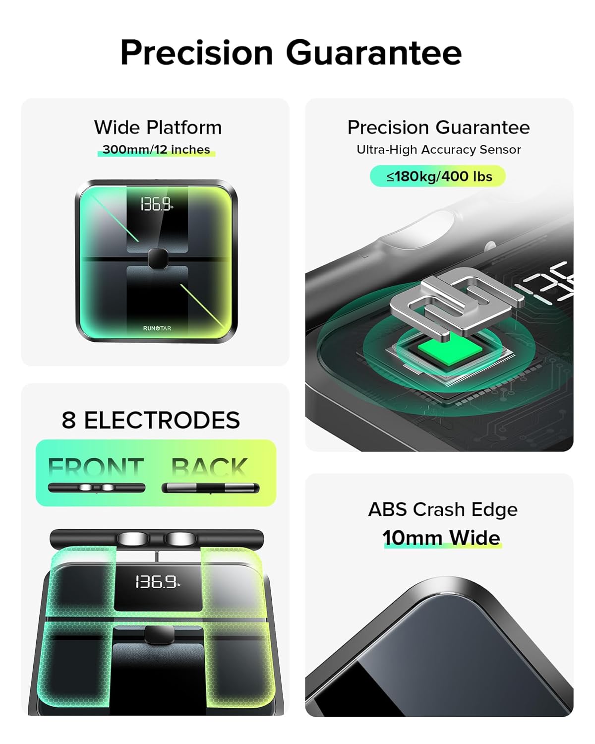 - Full-Body Scan at Home: The RunStar smart body fat scale uses an 8-electrode, dual-frequency BIA system to capture upper and lower body impedance for more complete insights. Track 28 body composition metrics—including Body Fat, BMI, Visceral Fat and Muscle Mass—with 0.1 lb increments and up to 400 lb capacity.