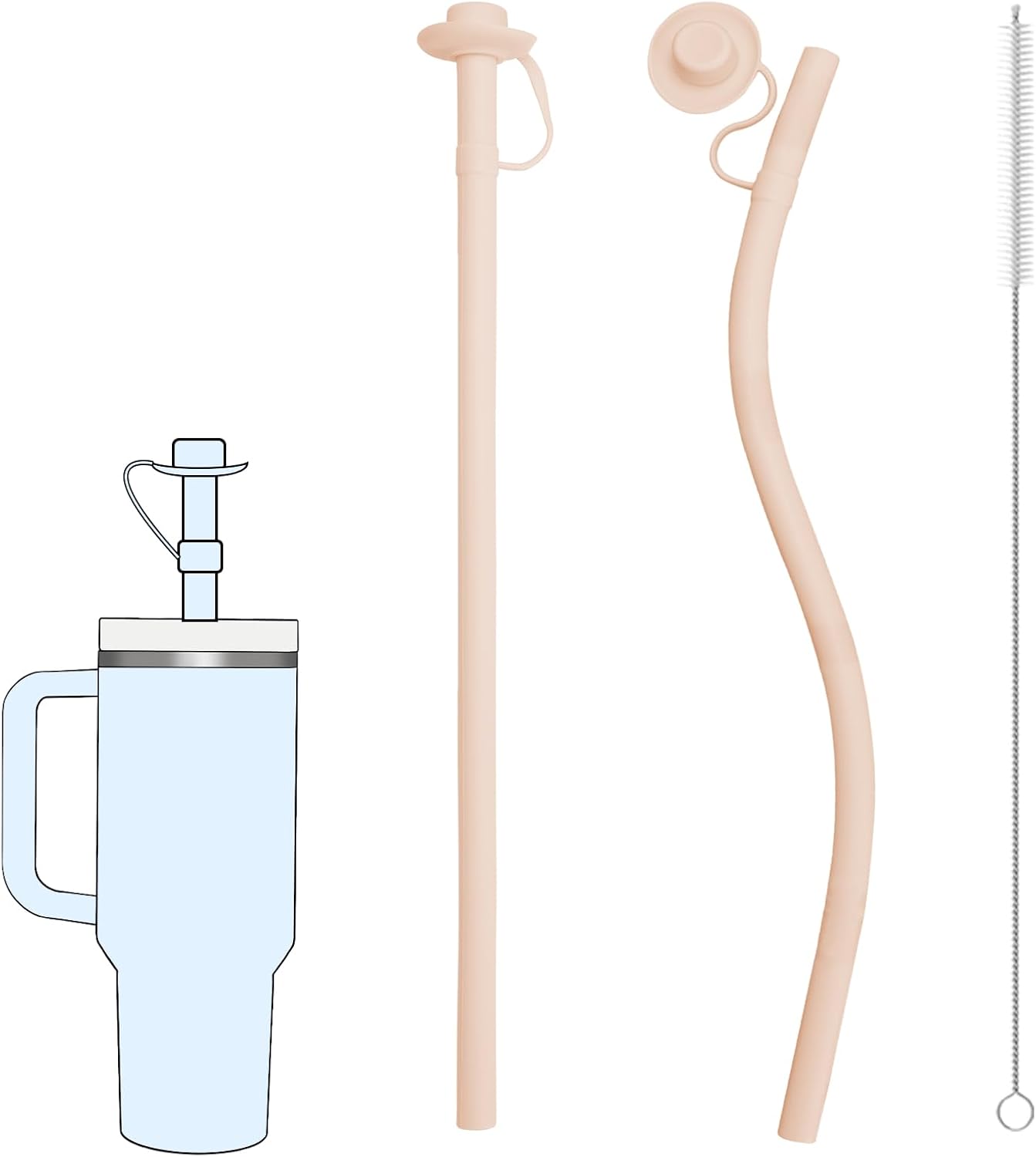 2PCS Reusable Silicone Straws with Cover, Bite-Safe, 12”Long Collapsible Drinking Straws for Stanley Owala Cups, Tumblers & Travel – Trim to Fit Any Cup (Pink)