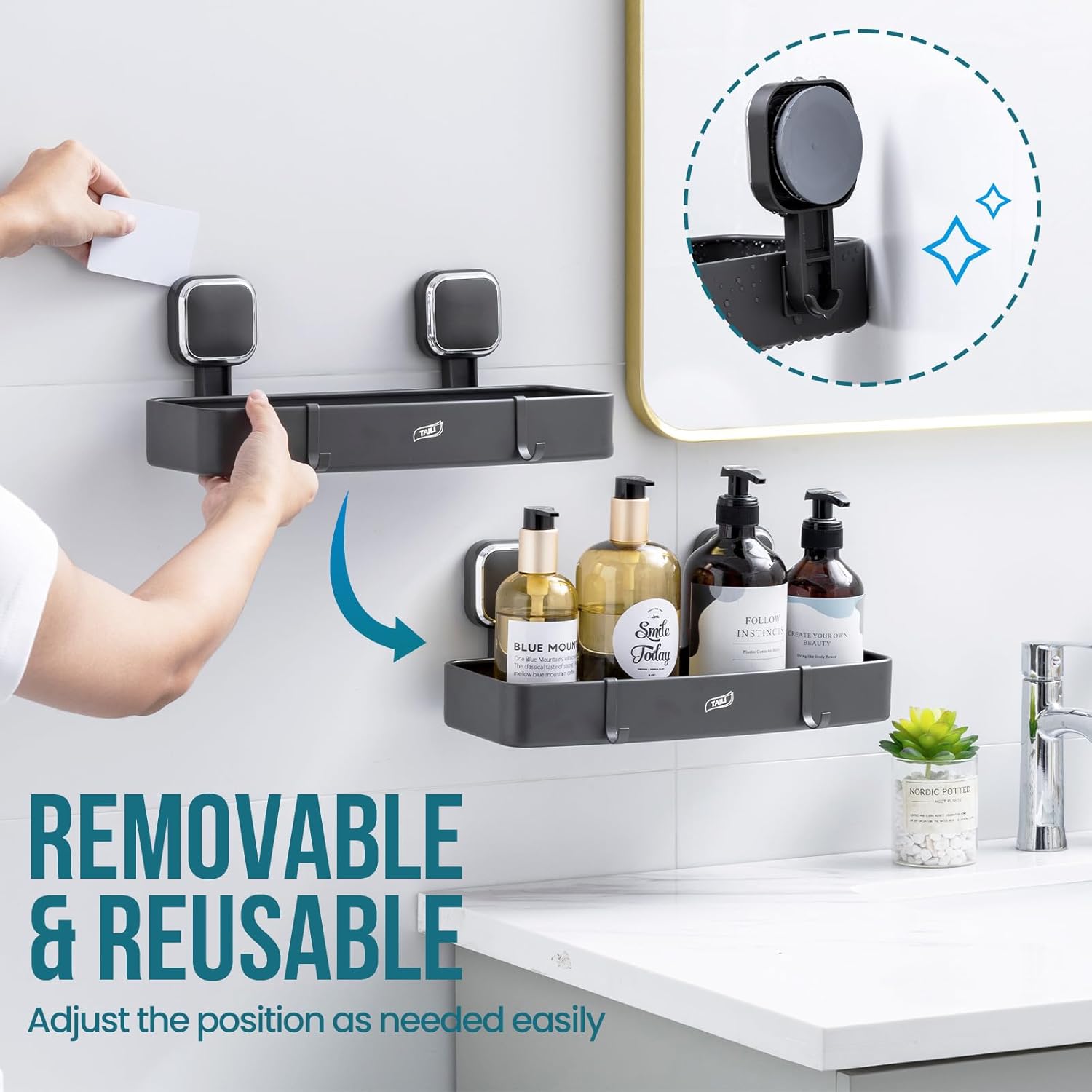 TAILI Shower Caddy Suction Cup, Heavy Duty Shower Organizer for Bathroom, Removable Shelves for Inside Shower, Wall Mounted Aluminum Storage for Bathroom Holder, Dark Gray