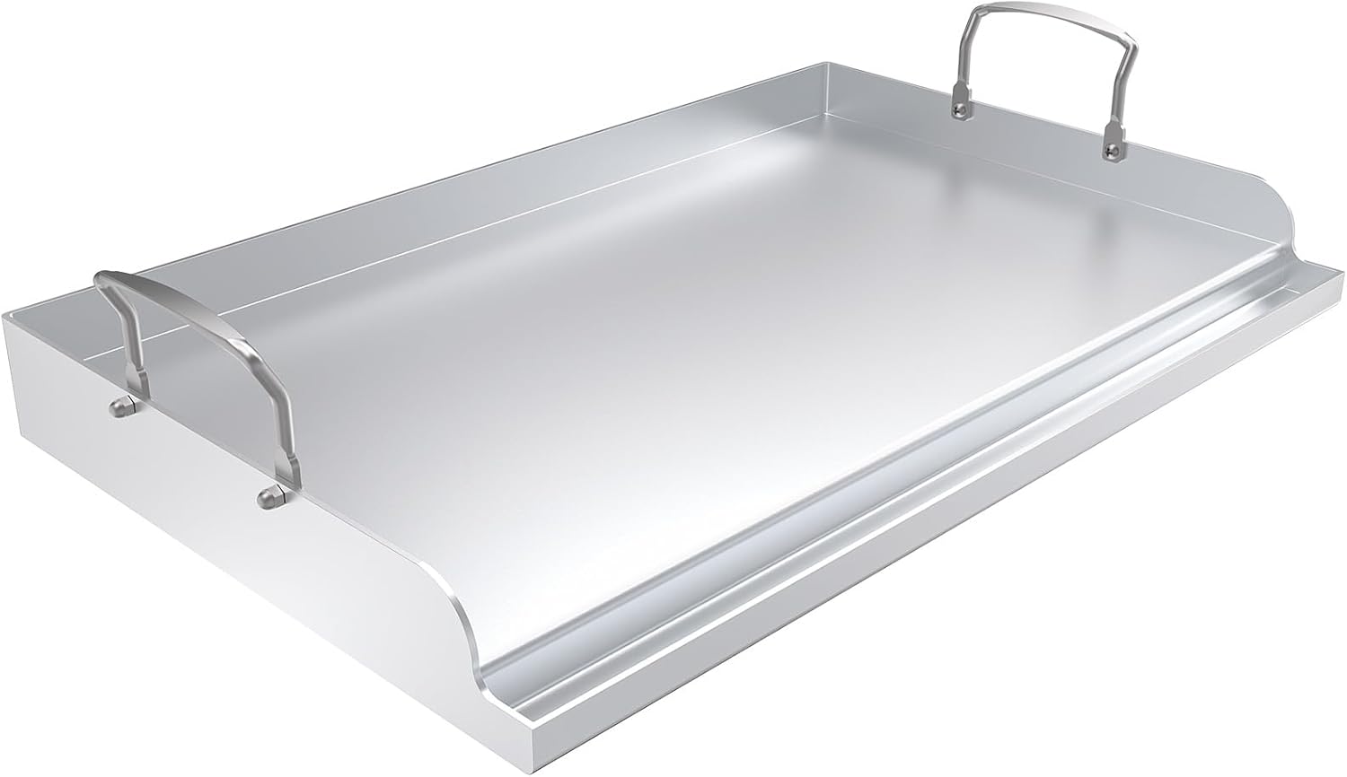 - ( Premium Stainless Steel Construction) This stainless steel griddle pan built from heavy-duty stainless steel, durable, and resists warping even under high heat. The advanced nonstick nano ceramic coating ensures safe cooking, effortless food release, and quick cleanup. Lighter than traditional cast iron, this lightweight grill accessory** is easy to lift, move, and store—perfect for both backyard BBQs and on-the-go cooking
