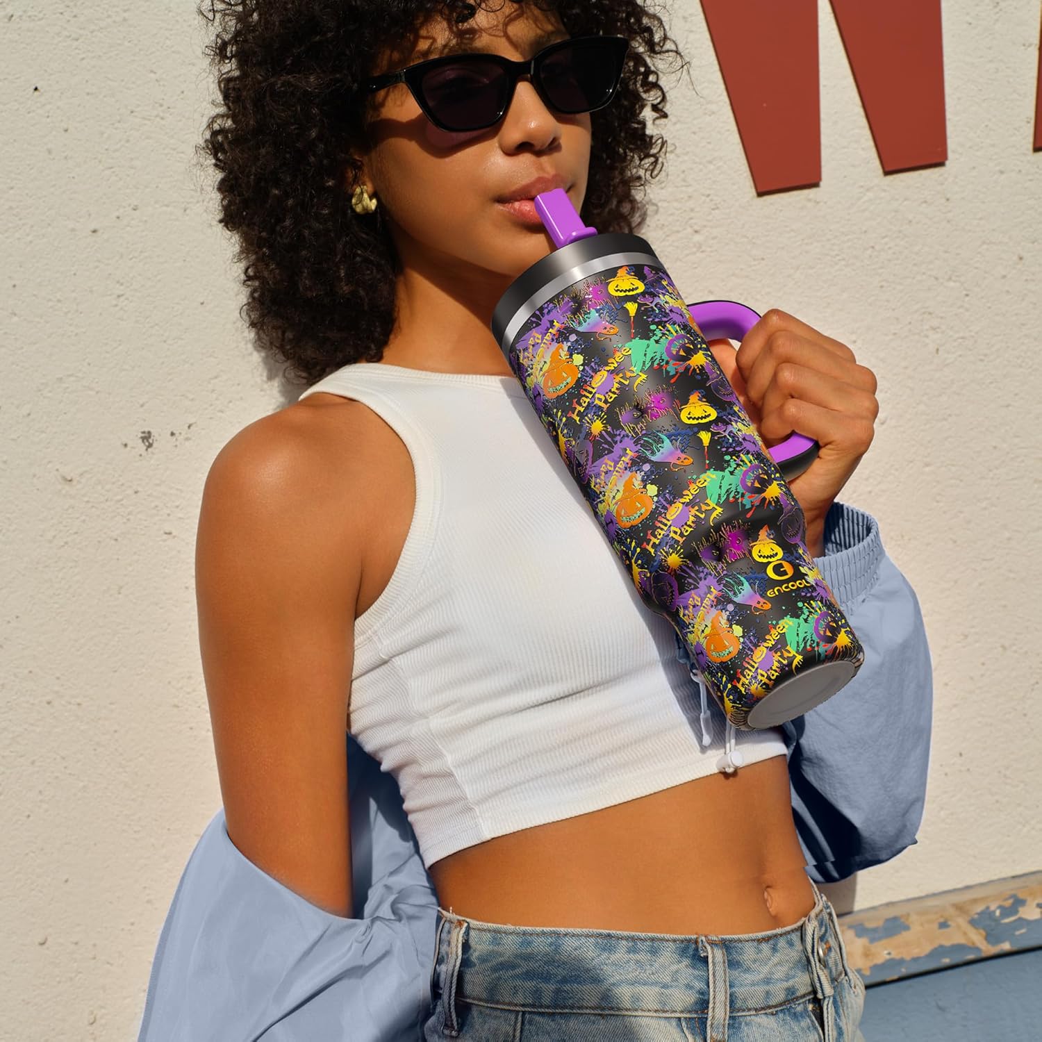 ENCOOL 40 oz Tumbler with Handle and Straw: Stainless Steel Insulated Tumbler Keeps Cold for 24 Hours, Leakproof Travel Cup Fits in Cup Holder and BPA-Free, Meowgic Night