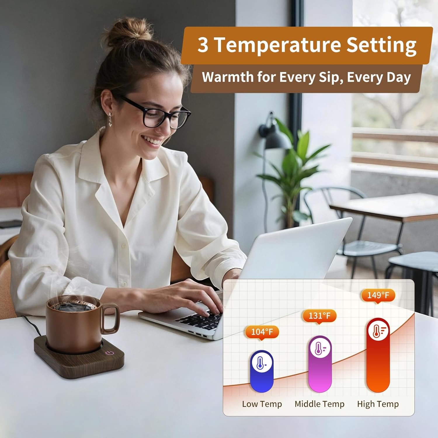 - Adjustable Three-Temperature Setting: VOBAGA coffee warmer will keep your coffee at a perfect drinking temperature. You can control the temperature by tapping the button, keeping your coffee or milk up to 104℉-131℉-149℉ (40℃-55℃-65℃). Changing temperature is just a tap on of your finger.