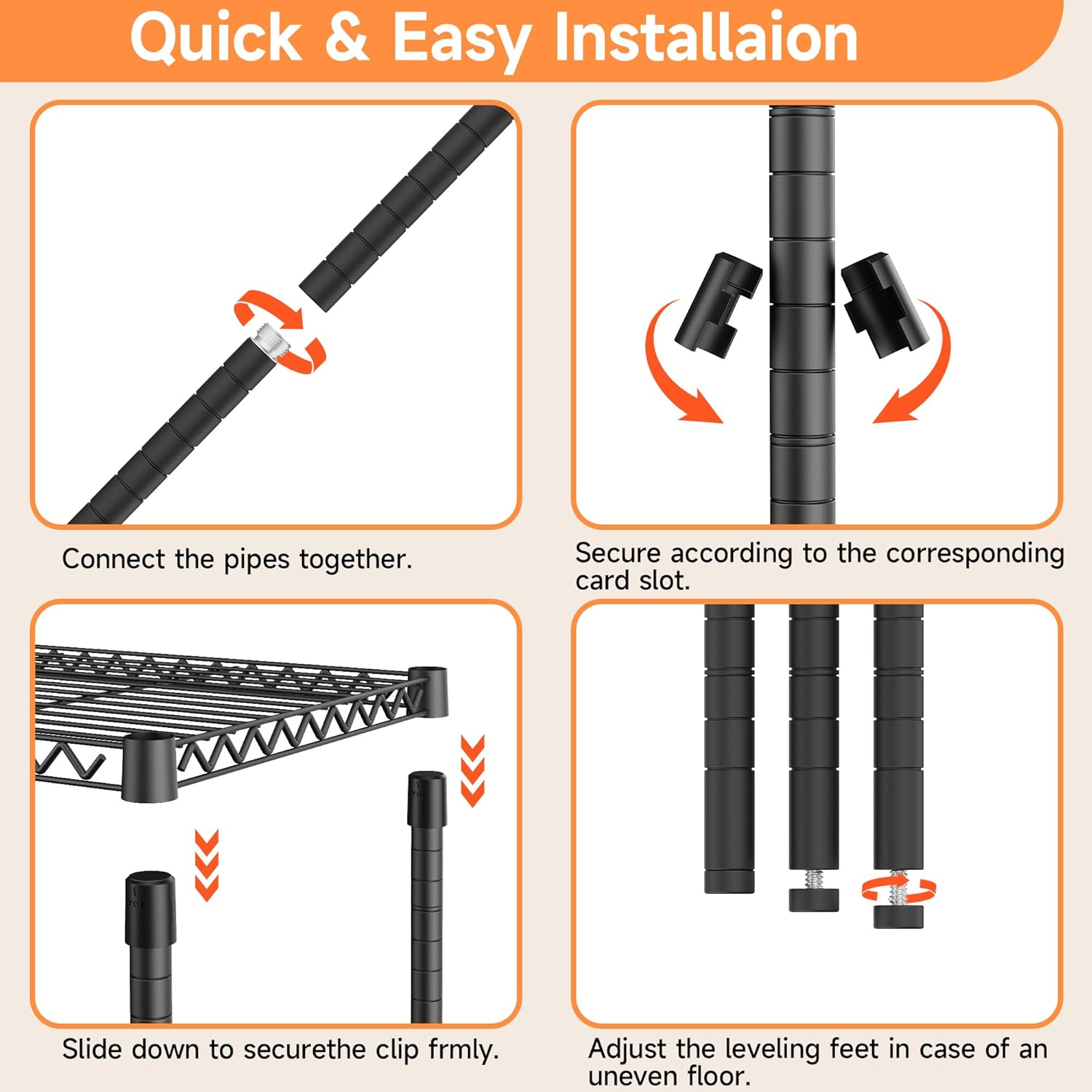 - HEAVY DUTY STORAGE SHELF: Our storage shelf is made of study high-quality carbon steel and metal rods and each shelving unit holds up to 660LBs on leveling feet, with a total bearing capacity of 2640LBs