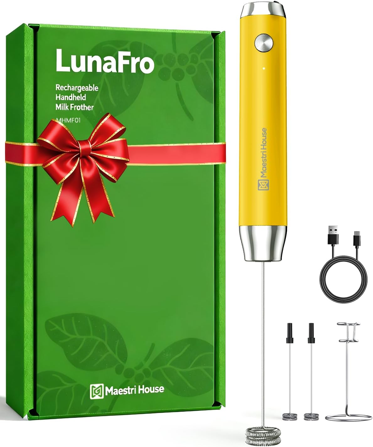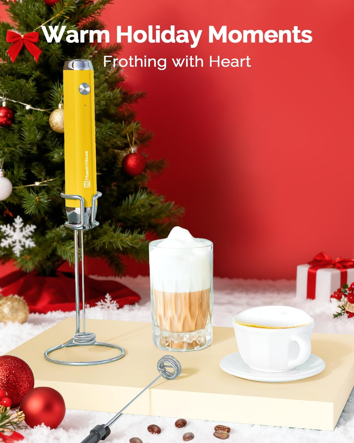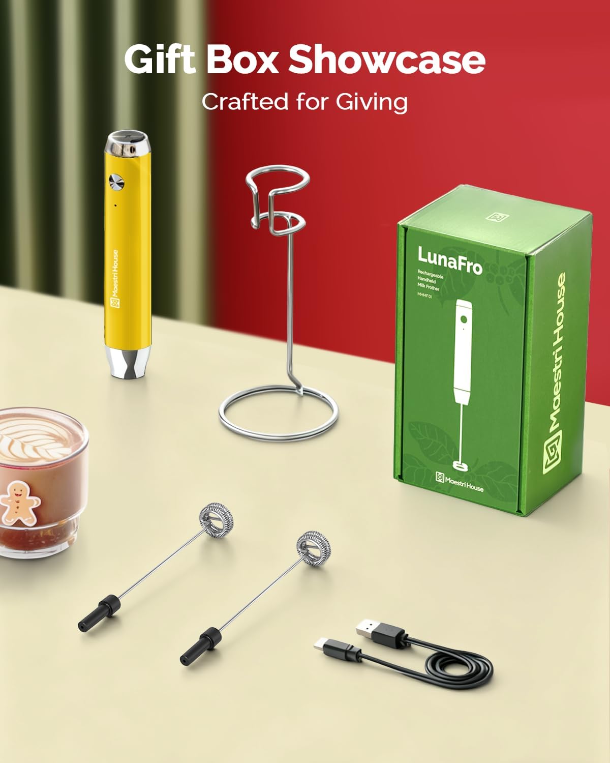 Maestri House Rechargeable Milk Frother with Stand, Handheld Electric Foam Maker Waterproof Detachable Stainless Steel Whisk Drink Mixer Foamer for Lattes, Cappuccino (Warm Yellow (Gift Box))