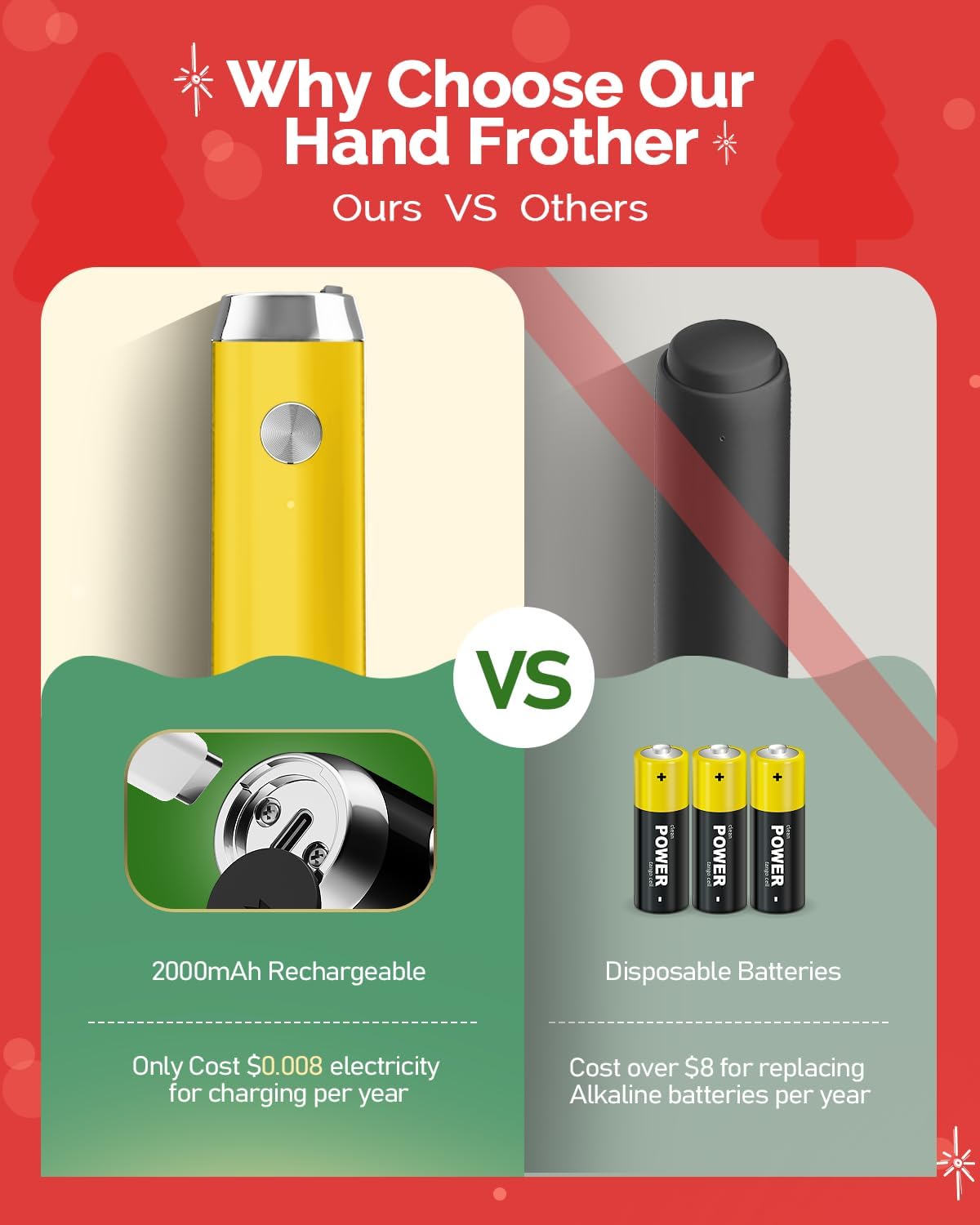 - USB-C Rechargeable for Long Battery Life: Unlike other battery-operated milk frother, this rechargeable milk frother has a built-in 2000mAh lithium battery, so there is no need to replace the battery frequently. This rechargeable foam maker can be fully charged about 3 hours for 2-3 months using(including USB-C charging cable). The white light flashes slowly when charging, and turns off after being fully charged.