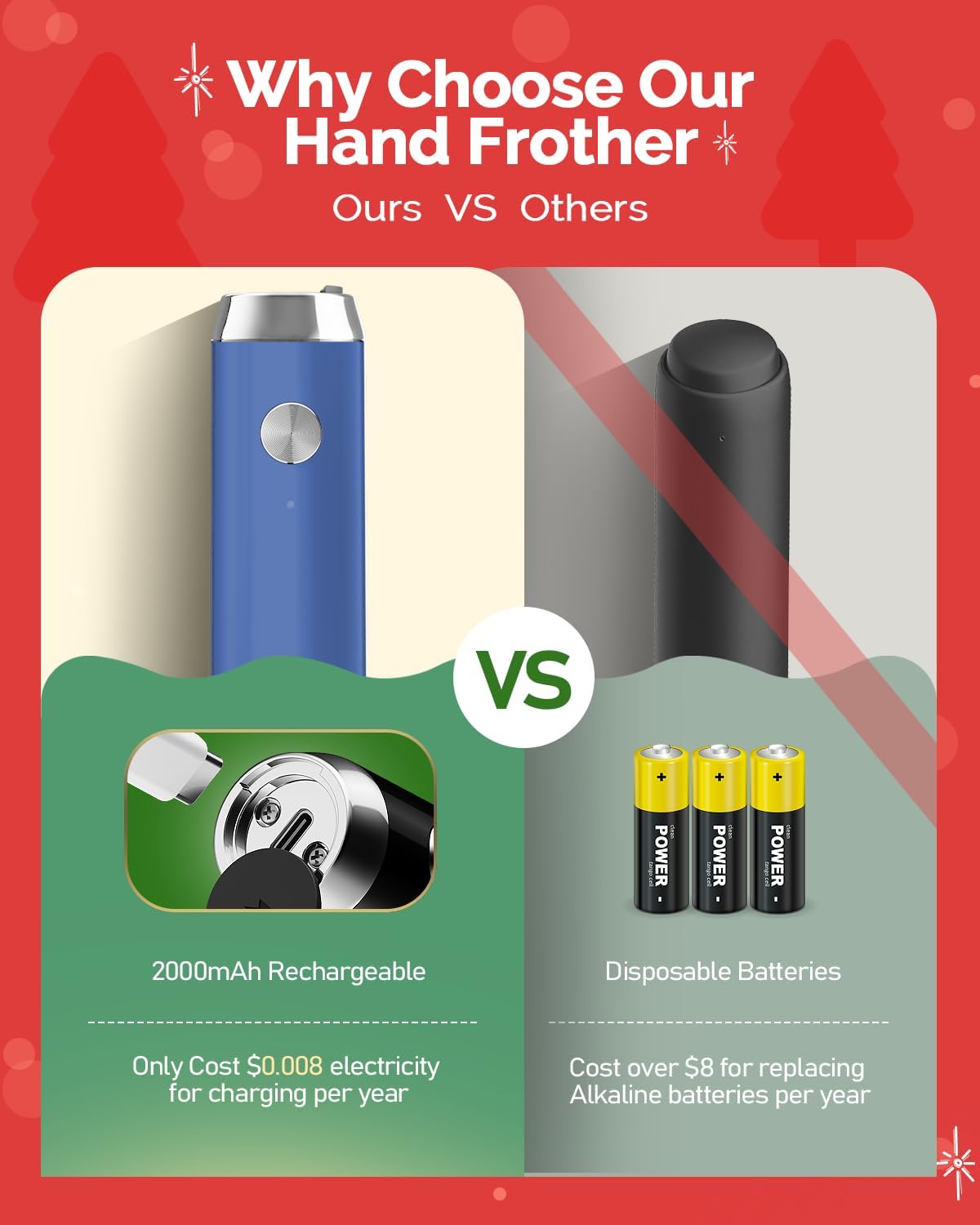 - USB-C Rechargeable for Long Battery Life: Unlike other battery-operated milk frother, this rechargeable milk frother has a built-in 2000mAh lithium battery, so there is no need to replace the battery frequently. This rechargeable foam maker can be fully charged about 3 hours for 2-3 months using(including USB-C charging cable). The white light flashes slowly when charging, and turns off after being fully charged.