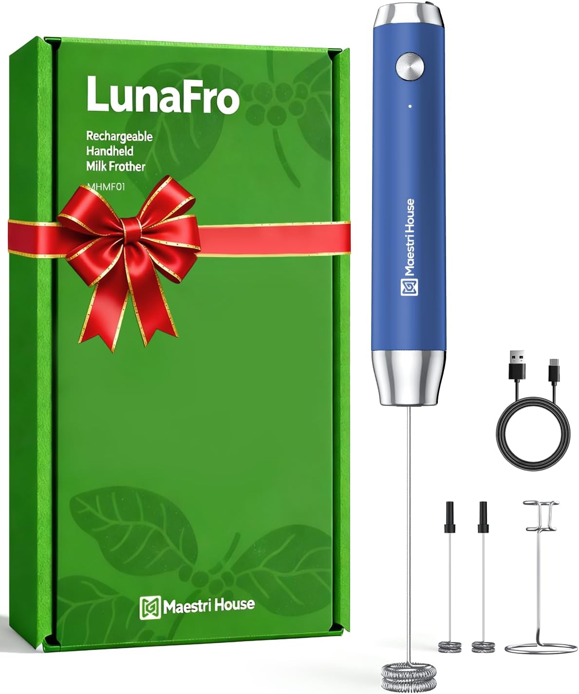 Maestri House Rechargeable Milk Frother with Stand, Handheld Electric Foam Maker Waterproof Detachable Stainless Steel Whisk Drink Mixer Foamer for Lattes, Cappuccino (Midnight Blue (Gift Box))