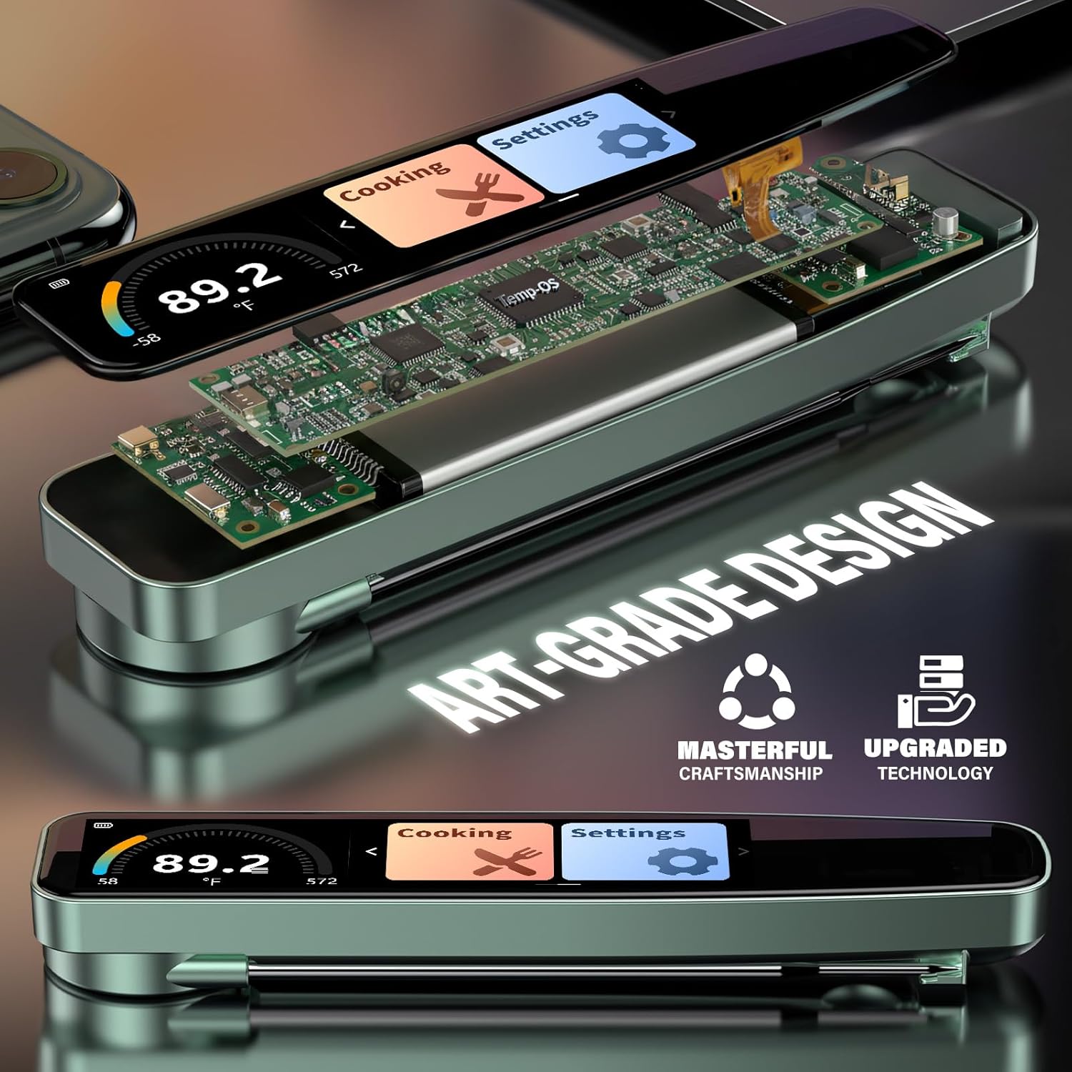 - 【3.8″ HD Touchscreen | Temp-OS System】 Smartphone-like UI right on the device—no Bluetooth/Wi-Fi pairing, no app. Touch to set meat type/doneness/target temp/brightness; English & Spanish interface; digital instant read meat thermometer that feels modern