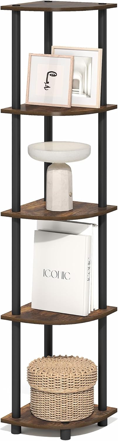Furinno Turn-N-Tube Corner Shelf, 5-Tier Corner Bookshelf, Open Storage Shelves, for Organization and Storage, Living Room, Home Office, Garage, Bedroom, Amber Oak