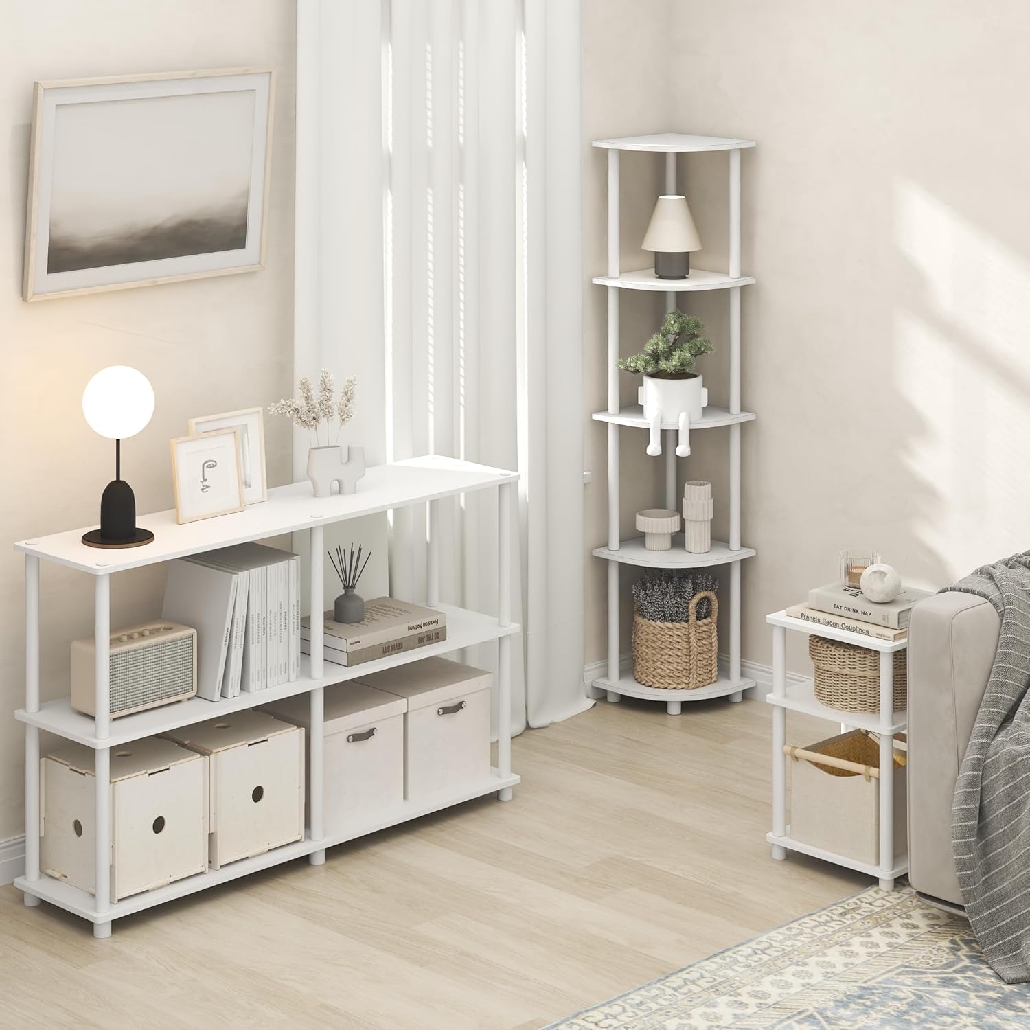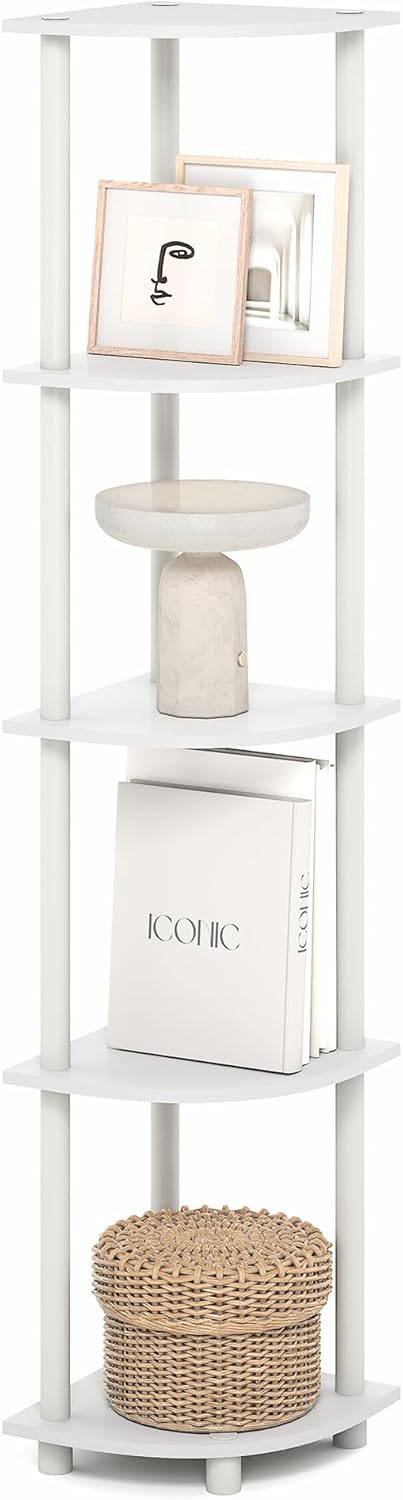 Furinno Turn-N-Tube Corner Shelf, 5-Tier Corner Bookshelf, Open Storage Shelves, for Organization and Storage, Living Room, Home Office, Garage, Bedroom, Plain White