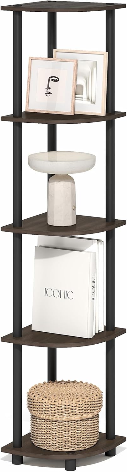 Furinno Turn-N-Tube Corner Shelf, 5-Tier Corner Bookshelf, Open Storage Shelves, for Organization and Storage, Living Room, Home Office, Garage, Bedroom, Brown Grain
