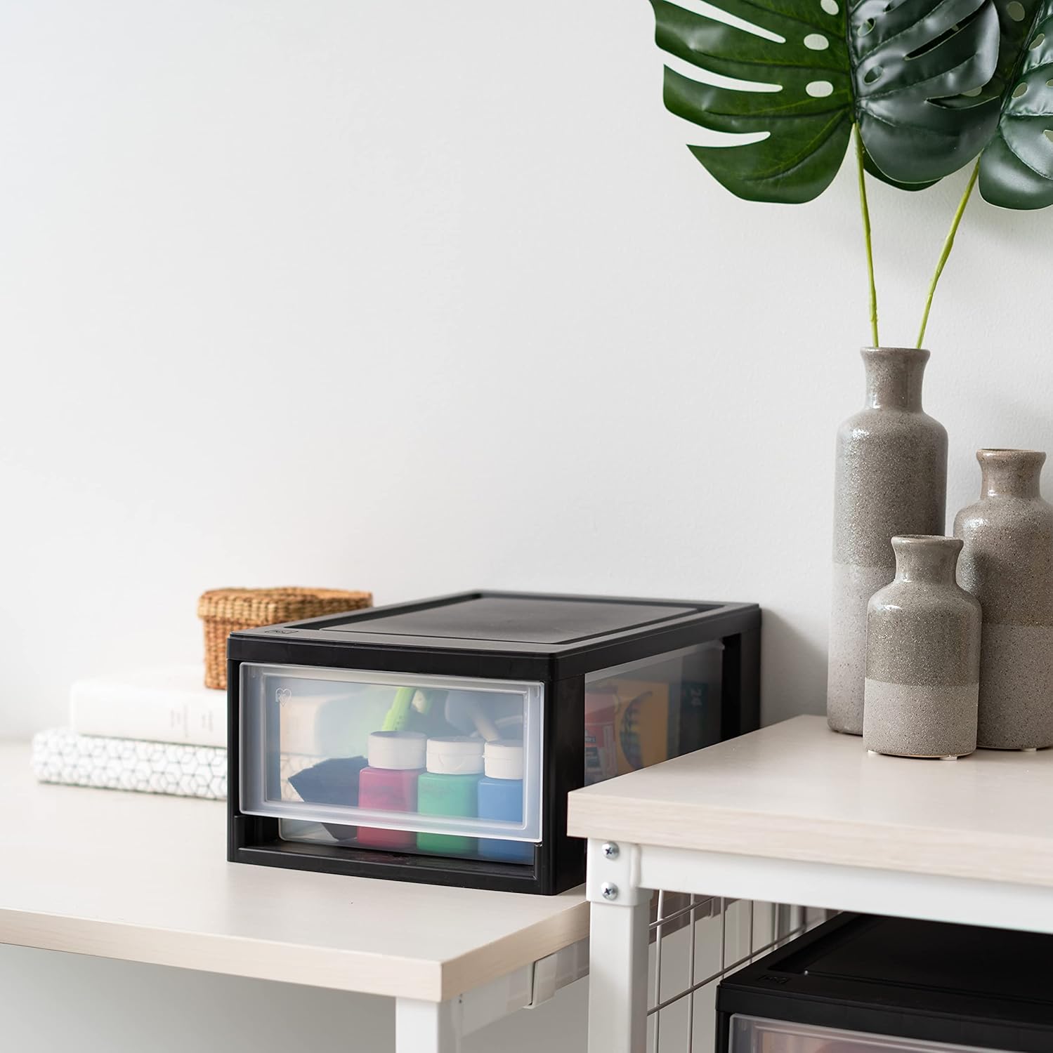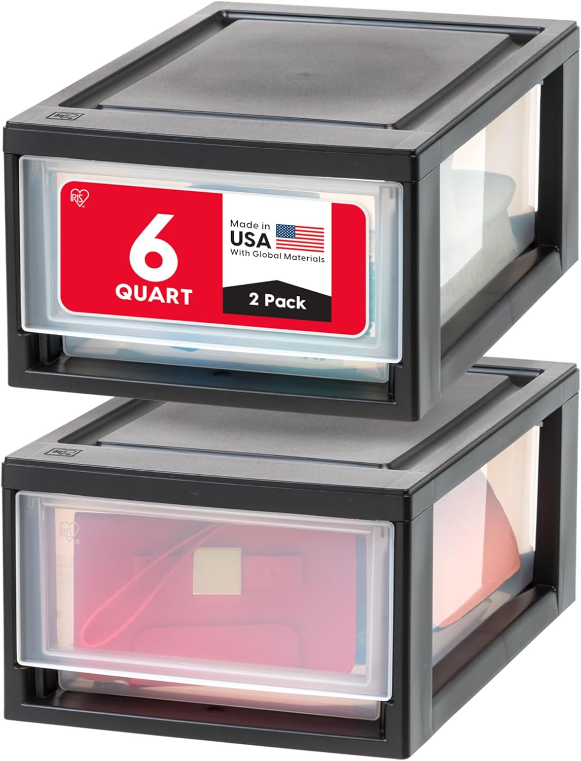 IRIS USA 6 Qt. Plastic Drawer Storage Organizer Stacking Drawers, 2-Pack, Stackable Unit with Sliding Drawer for Bedroom Kitchen Under Sink Pantry Craft Room Bathroom Dorm Office, Black