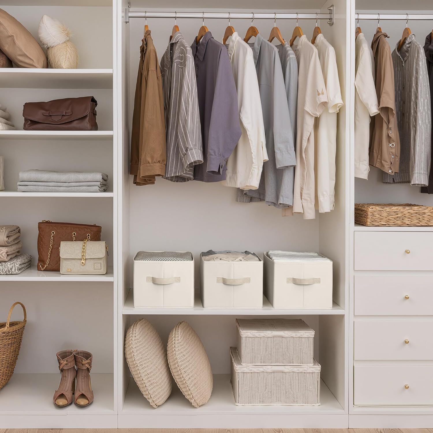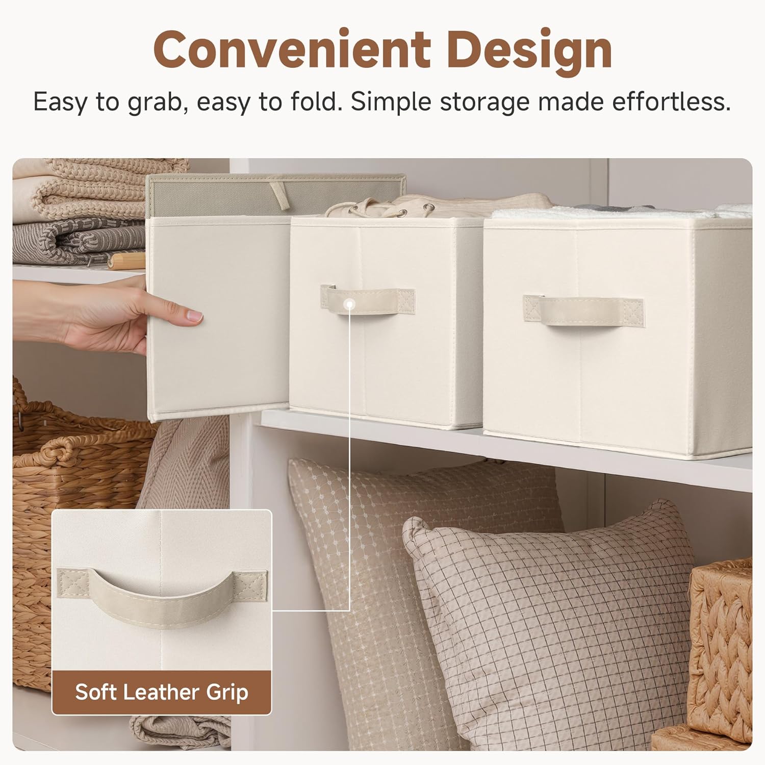 - Leather Handles: Soft leather handles provide a secure, comfortable grip, making it easy to lift or slide bins from shelves or closets.