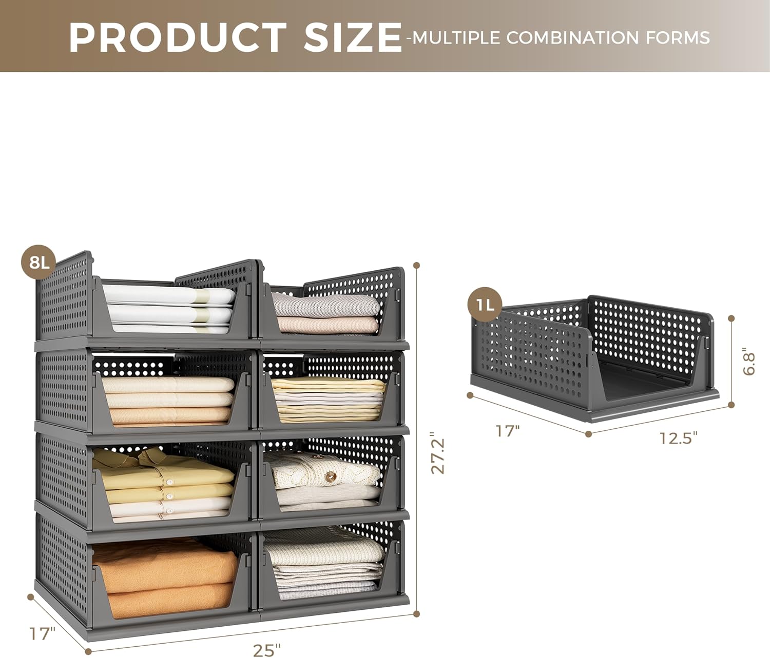 - 【Assembly Easily & Stackable】: Easy to set up, follow the steps in pictures. Adjust to your own liking by stacking the perfect number to fit your own space. Set of 4 wardrobe clothes organizer can be stackable which make home space organized, max the use of vertical space. You can stack multi-layer wardrobe storage organizer according to your needs freely. Dimensions of each when set up: 17" x 12.5" x 6.8" (L x W x H).