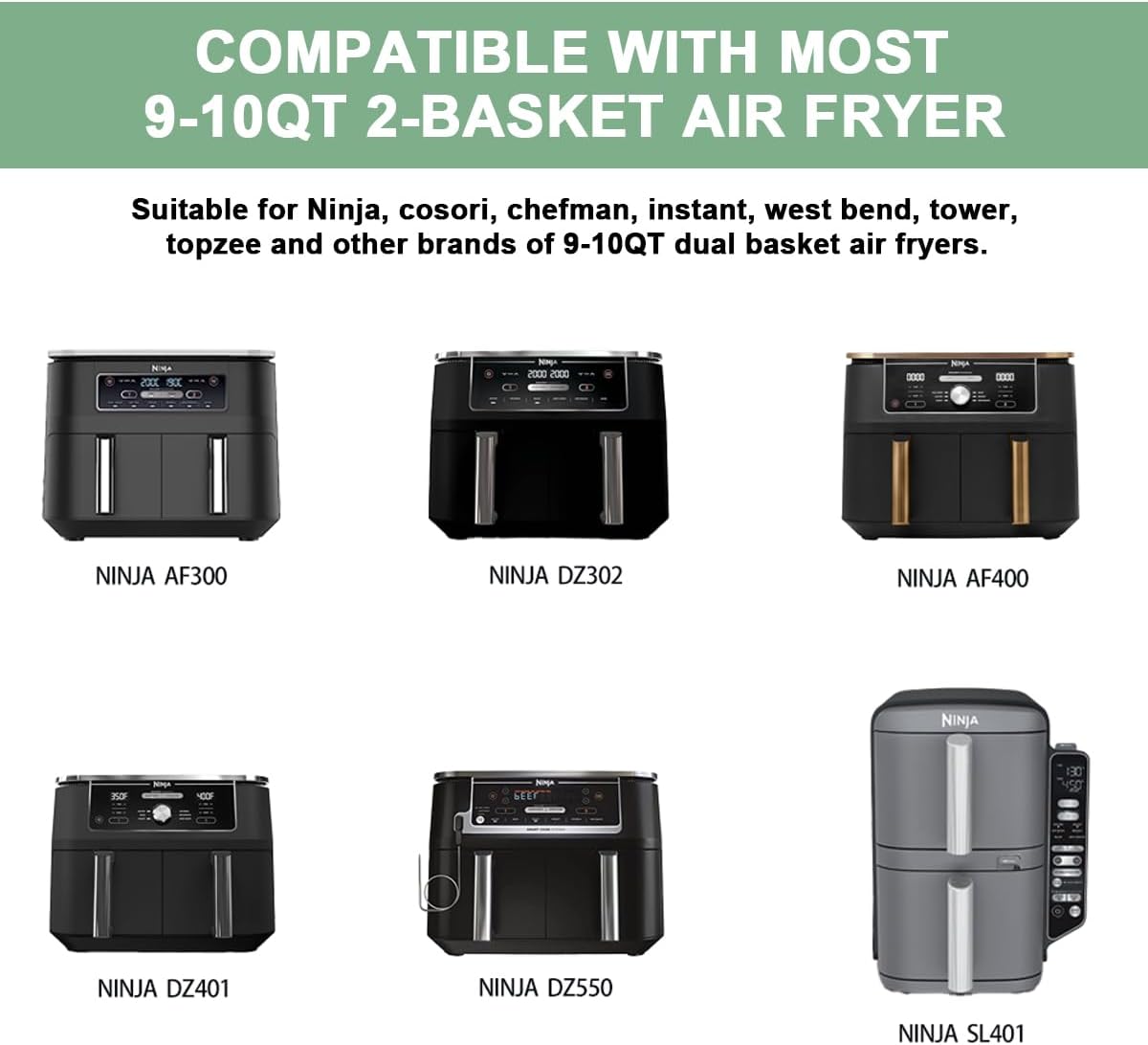 - ✅Single-basket air fryer dimensions: approx. 21 x 14.5 x 8 cm (8.26 x 5.71 x 3.15 inches). Perfectly compatible with Ninja dual-zone/dual-layer digital air fryers (DZ201/ AF400/ AF400/ SL401/ DZ550/ DZ401/ DZ302) and other brands of dual-basket 9-10QT air fryers. An excellent alternative to disposable paper liners.