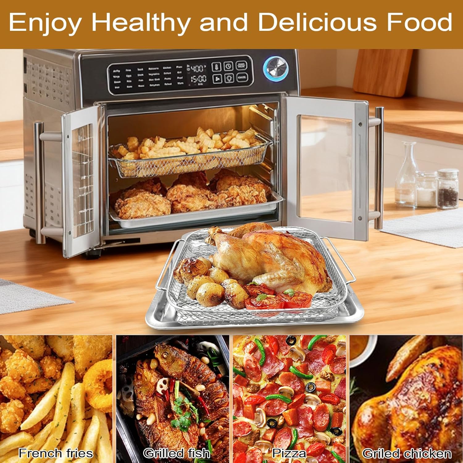 - Precision Fit & 5-in-1 Valuable Sets: Designed specifically for Emeril Lagasse 26 QT Extra Large Capacity Stainless Steel Air Fryer Ovens. The set includes 1 grill pan, 1 baking rack, 1 grill rack, 2 reusable baking mats, and 100 sheets of baking paper. It provides a comprehensive solution for baking, air frying, grilling, and more—no need for separate purchases, offering exceptional value