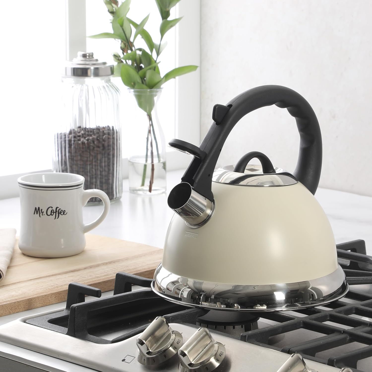 Mr. Coffee Clarefield 2.4 Qt Whistling Tea Kettle – Linen White Stovetop Water Kettle with Lid, Heat-Resistant Nylon Handle and Knob, Stainless Steel Trim
