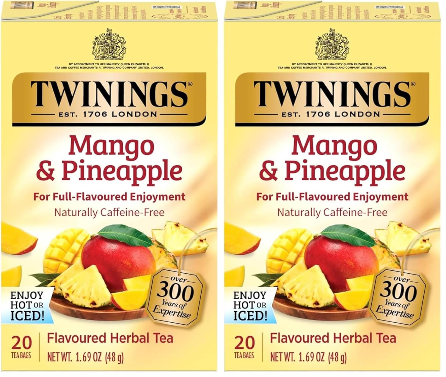 Twinings Mango & Pineapple Herbal Tea Individually Wrapped Bags, 20 Count (Pack of 2), Naturally Caffeine-Free, Enjoy Hot or Iced, 20 Teabags